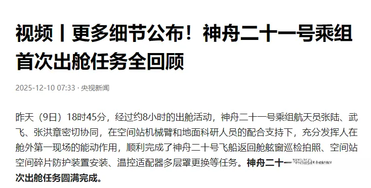 2025年12月9日上昼,问天试验舱的出舱舱门冉冉掀开,神舟二十一乘组的初度出舱任务肃穆启动。